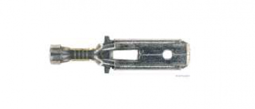 Seckerausführung Flachstecker, versilbert, Messing, von 1 mm², bis 2,5 mm², Steckbreite 6,3 mm, Steckhöhe 0,8 mm, Länge 28 mm, Form vorgeformt, mit Rastnase, Version 3