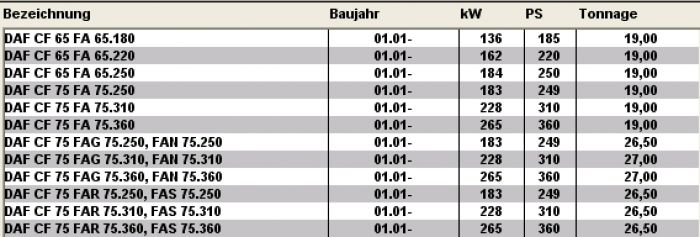 DAF - CF 75 - FAT 75...   01.01 -      183 - 265     249 - 360       9200   Pritsche/Fah