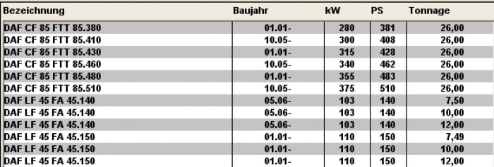 DAF - CF 85 - FAX 85...   01.01 -     279 - 351     380 - 477     12580   Pritsche/Fah