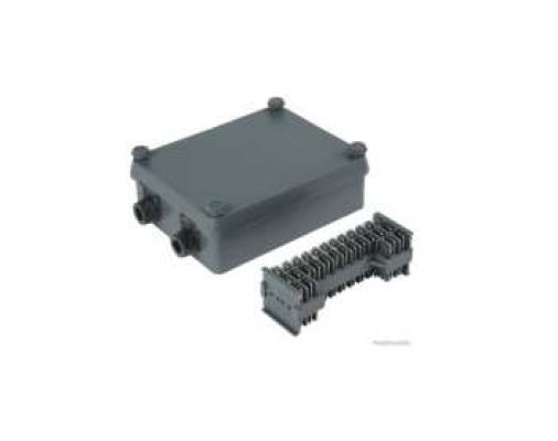 12 -polig, Anschlußanzahl 28, Flachsteckanschluß, Anschlußtechnik 8x2 + 4x3, Steckbreite 6,3 mm, Anzahl d. Ein-/Ausgänge 4, Einlass-Ø 2x10 mm, Auslass-Ø 2x10 mm, Anzahl der Bohrungen 2, Bohrung-Ø 6 mm, Abstand der Befestigungsbohrungen 90 mm, Gehäuse mit Kunststoff-Deckel, Schutzart IP 55, Kunststoff, Breite 132 mm, Höhe 41 mm, Tiefe 102 mm